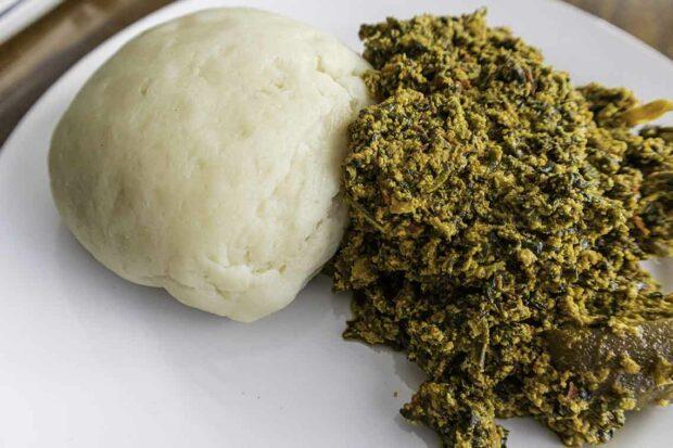 Pounded yam can be enjoyed with different types of savory stews and soups. Examples are egusi soup (melon seed soup), or efo riro (leafy vegetable stew).