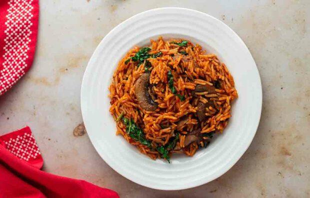 Nigerian Jollof rice recipe usually contains tomatoes, onions, peppers, chili and spices that can be served with chicken, beef, eggs, turkey or fish. However, vegetarians choose to accompany it with plantains and/or Nigerian salad.