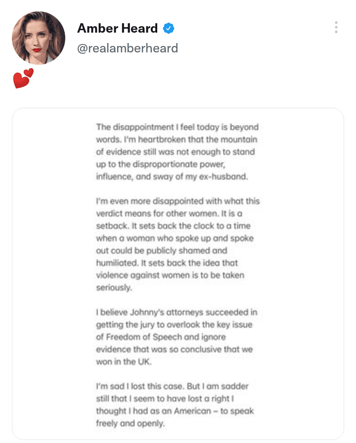 Amber Heard took to her Twitter handle to express her disappointment, following the outcome of the case.