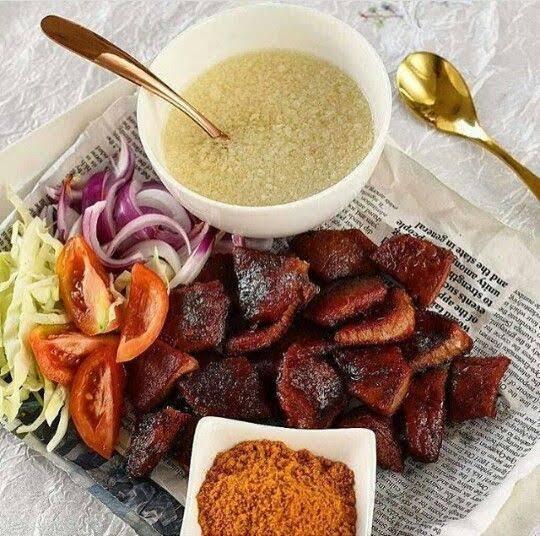 This combo is mostly eaten by students in the higher institution and it’s prepared mostly by abokis. Usually, it is eaten alongside fried egg. It is prepared by opening up the bread and putting the fried egg and suya inside, then pressing it down on a frying pan with little oil till it becomes flat.