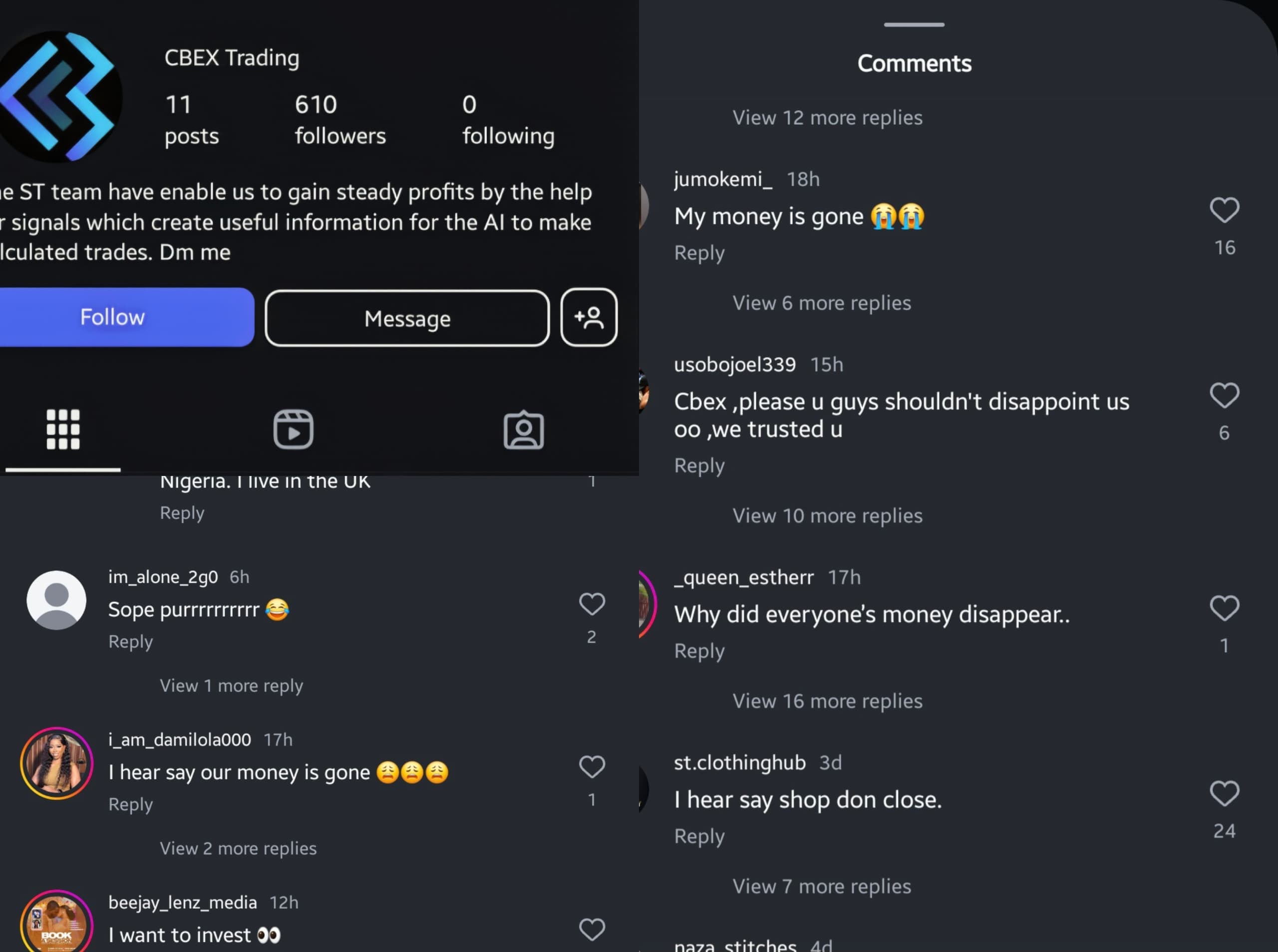 Shortly after the incident, several individuals who say they invested in the platform began sharing their experiences online. Screenshots and testimonies show account dashboards dropping to zero, with some users claiming they could no longer withdraw their funds.