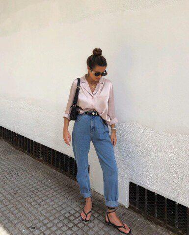 For a business casual look, consider pairing your mom jeans with an oversized or a structured blazer. You can either wear a T-shirt underneath or a bralette. Combine with a cute pair of court shoes or boots for a more sophisticated look. You can wear this to work, a lunch date or any other casual event.